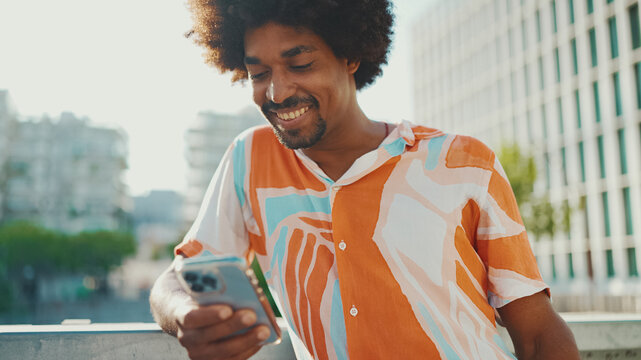 Closeup young African American man wearing shirt writes in social networks on mobile phone on urban street background. Camera moving forwards approaching to the person.