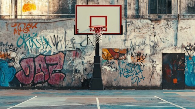 A basketball court with a hoop and scoreboard, urban setting with graffiti on walls, Street style