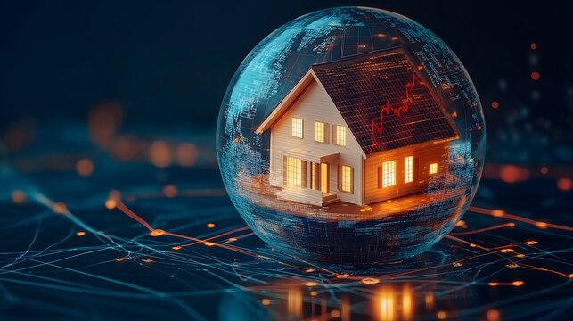 House inside transparent globe with digital connections and growth patterns depicted, representing modern housing trends and technology integration