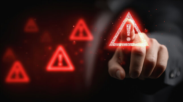 A person points at a glowing red warning icon with an exclamation mark, symbolizing caution or alert on a digital interface.