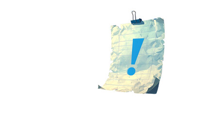 Crumpled paper with an exclamation mark hanging on a clip against a black background, illuminated