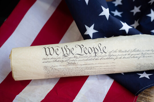 Preamble to the Constitution of the United States and American Flag. Old yellow paper with We The People text
