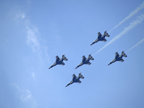 USAF Thunderbird Demonstration team fly in formation during an air show.