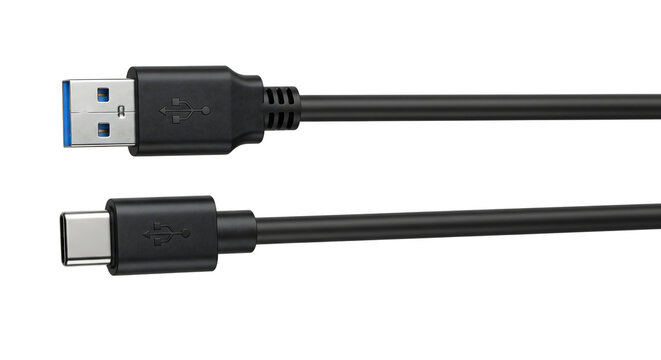 Black USB A to USB C cable for data transfer and charging, top view. Isolated on transparent background, png