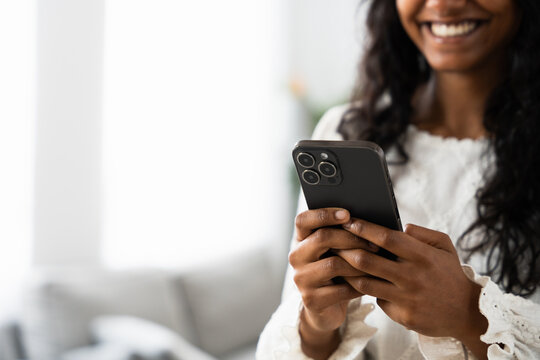 Black woman's hands using phone with white copy space. Positive Indian person surfing social media.
