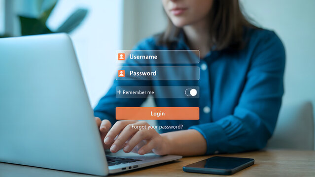 Woman logging in to a laptop with username and password fields displayed on the screen interface view