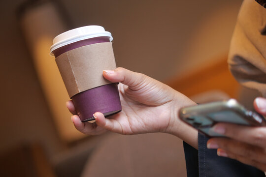 Holding a coffee cup while using a smartphone