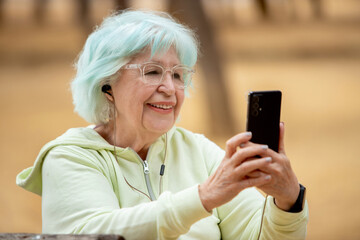 Elderly woman enjoys using smartphone outdoors