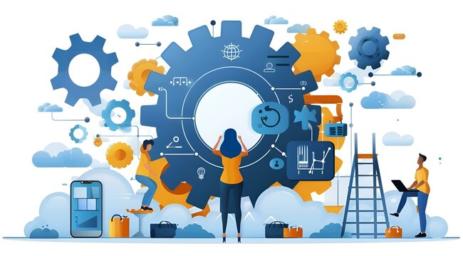 Team of workers at computers surrounded by gears and tools in a busy office setting.
