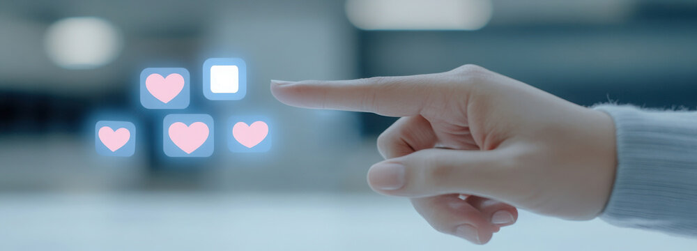 Man finger clicks on the user icon person.User symbol for your web site design, logo, app, UI. Which is a virtual projection from a mobile phone. Neon , red blue lights.