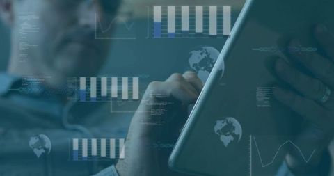 Mid-adult man tapping tablet touchscreen with data dashboards and global analytics overlay