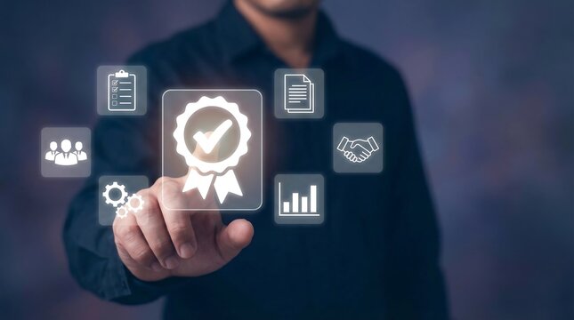 human hand holding digital identification card, with Checkmark Icons for Identity verification, ID card with checkmark. Personality approve. Employee badge.
