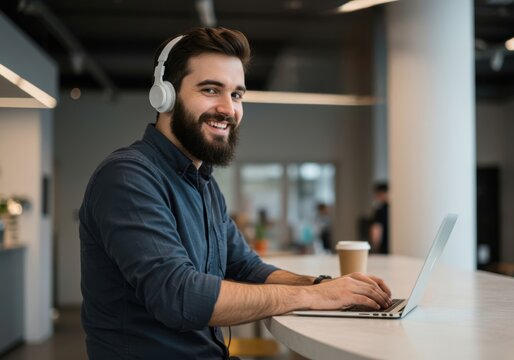 Smiling bearded man wearing headphones works on a laptop at a modern office counter with a coffee cup nearby
