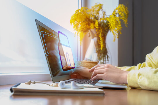 Close up of hands using laptop keyboard with abstract glowing fingerprint interface on blurry background. Login and authorization concept. Double exposure.