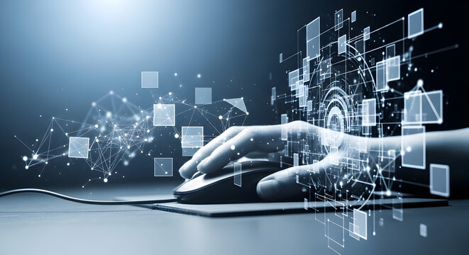 Innovative tech user navigates abstract digital network with futuristic data visualization