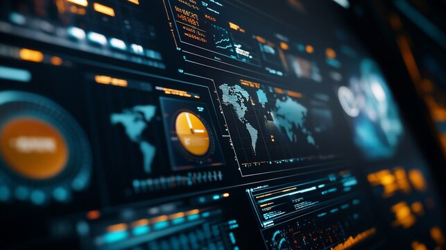 A close-up of a computer screen displaying a futuristic user interface with a variety of data visualizations and graphs.