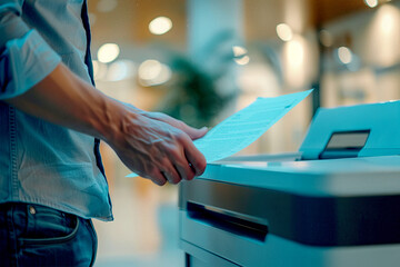 Person operating a modern office printer, printing documents in a professional workspace setting with blurred background.