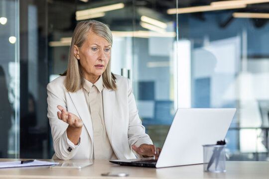 Dissatisfied and disappointed senior gray haired business woman at workplace, female boss received online notification on laptop about poor and unsatisfactory achievement results.