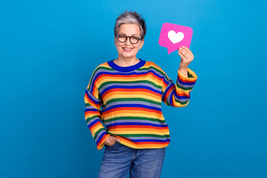 Photo of cheerful aged person toothy smile hand hold paper like notification card isolated on blue color background