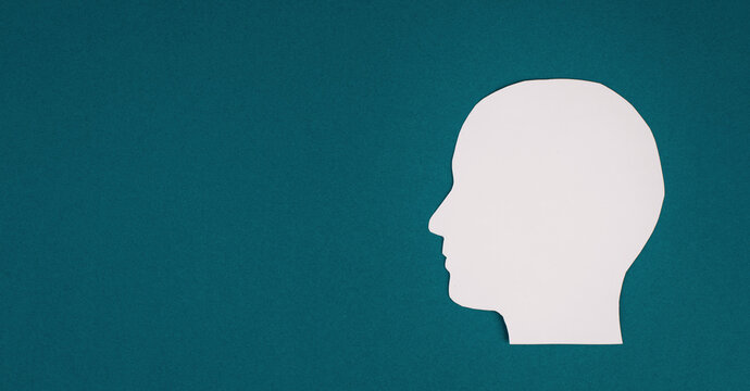 Face paper cut out, petrol colored background, copy space for text