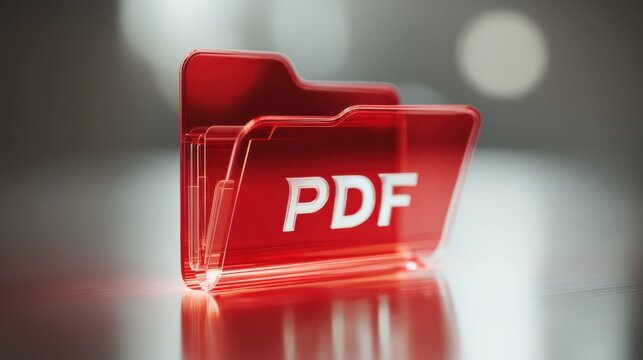 A translucent red digital folder icon labeled "PDF" on a reflective surface with a blurred background.