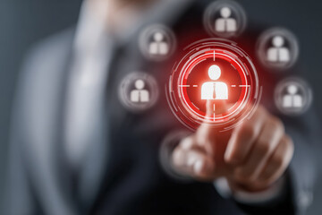 Businessman selecting human icon on digital interface concept for recruitment and talent acquisition in technology-driven corporate environment