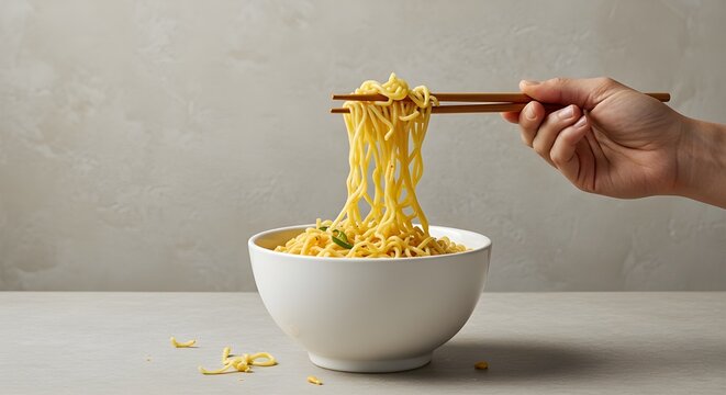 A delicious bowl of traditional asian noodles is ready to be eaten. A hand using chopsticks is about to take the noddles from bowl