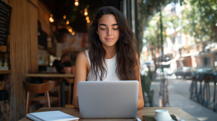 An elderly woman in a knit sweater is using a laptop while sitting at a cafe table with a coffee cup, highlighting a serene and comfortable environment.