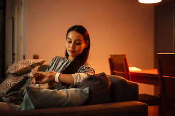 Close up woman looking at her smartwatch during doing exercise at home. People with wearables doing fitness.