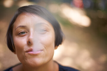 Portrait, woman and blowing smoke with mouth for addiction, mental health and nicotine in forest. Stress relief, female person and smoker for unhealthy, cannabis and habit to relax in Portugal