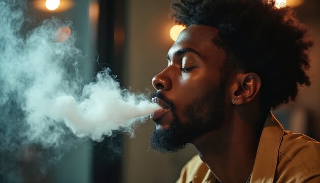 Stylish young black man smokes. Person exhales smoke. Portrait of man smoking indoors. He enjoys pleasure time. Guy shows modern lifestyle. Portrait of smoker. Smoke from mouth of man.