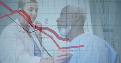 Doctor using stethoscope on patient with digital healthcare data overlay showing decline