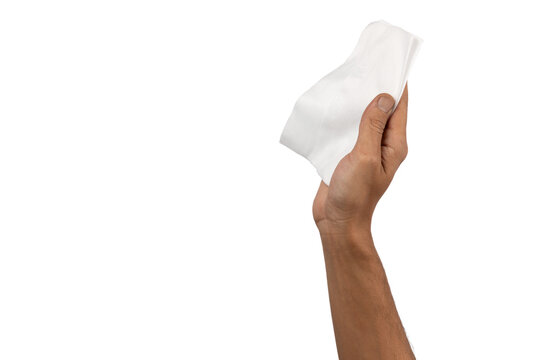 Hand holding, throwing used wiped tissue paper isolated on white background.