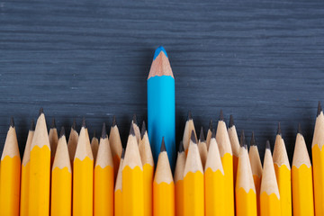 Celebratory pencil among usual pencils, on color background
