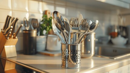 Close-up of a spoon holder with shiny utensils on a clean kitchen counter.