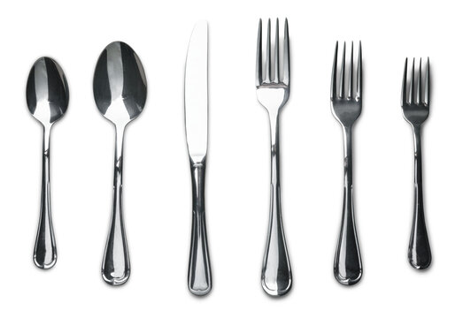 A set of silver cutlery featuring a fork, knife, and spoon, showcasing sleek and polished designs.