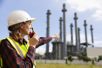 Senior female Electrical Engineers working to  check up on the progress of the project  and talk on a walkie-talkie In a Thermal  Power Station