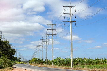 Worker wiring electric power on steel tower,  Electric construction and maintenance services throughout, Electric Power Transmission Infrastructure and Highest voltage transmission concept