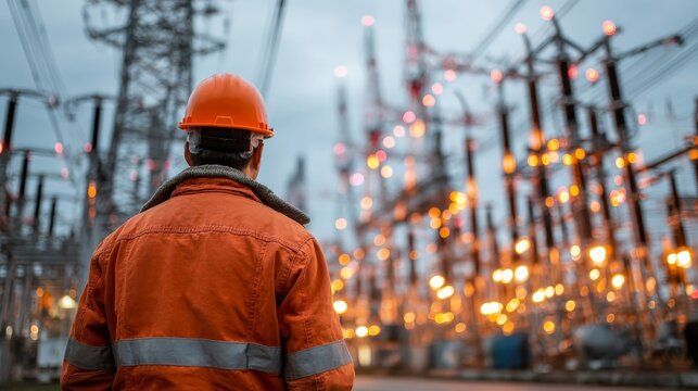 Group of Electricians in Safety Gear Working in Front of High Voltage Power Lines on a Sunny Day. Concept of Teamwork, Electrical Engineering, Safety, and Power Infrastructure