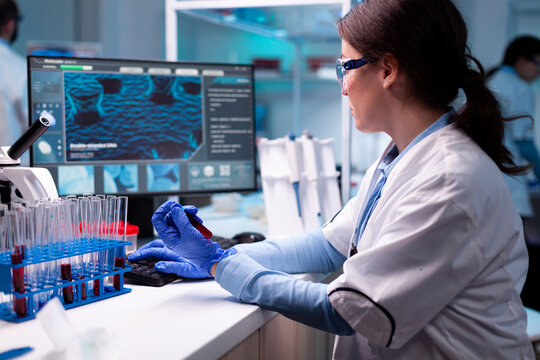 Scientist typing on laptop holding vacutainer blood healthcare chemistry. Researcher in chemical medicine lab working with professional technology equipment for healthcare development.