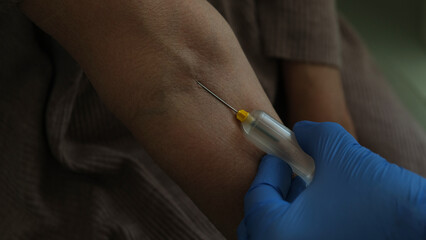 Close-up nurse looking for vein in patient hand using special vacutainer needle