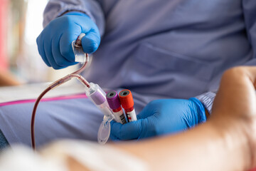 Medical professional collecting blood through a tube into vials using a vacutainer system. Blue gloves and clinical uniform visible, emphasizing healthcare and laboratory precision.