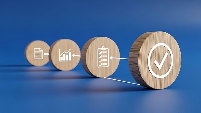 Wooden blocks illustrate a clear process flow from documentation and analysis to final successful completion