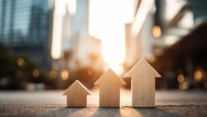 Wooden house shapes, ascending arrows, city backdrop