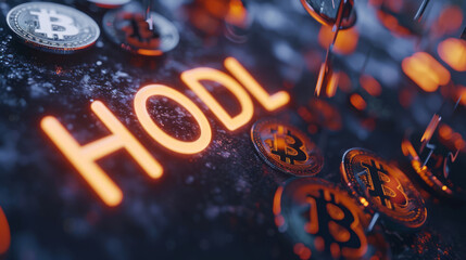 Neon orange Hodl sign with glowing Bitcoin crypto coins on the dark background, the cryptocurrency long term investment strategy of holding BTC during market fluctuations