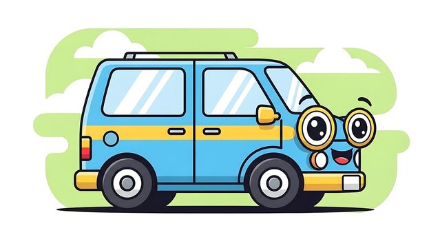 Yellow van with large sparkling eyes and pink accents, driving on a road