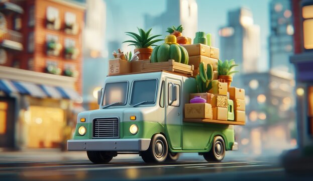 Animated delivery van loaded with produce