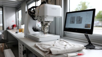 Inside the robotailor van a robotic arm expertly stitches fabric together in a smooth precise motion while a digital screen shows the customization options selected by the customer.