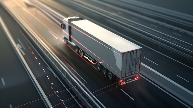Aerial view of autonomous truck driving on autopilot on a highway with traffic sensors scanning surroundings Cargo delivery transportation of the future Artificial intelligence Self dr : Generative AI