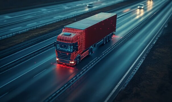 Aerial view of autonomous truck driving on autopilot on a highway with traffic sensors scanning surroundings. Cargo delivery, transportation of the future. Artificial intelligence. Self, Generative AI